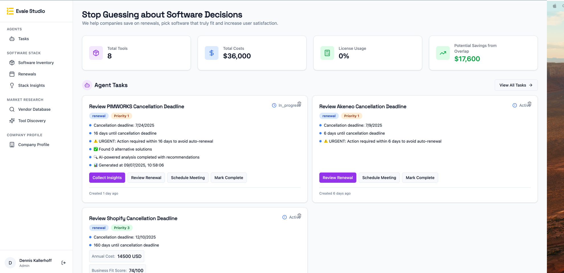 Some teams execute internally. Others continue with Evale Intelligence to keep the picture current: renewal alerts, usage signals, and a decision layer that doesn't go stale.
